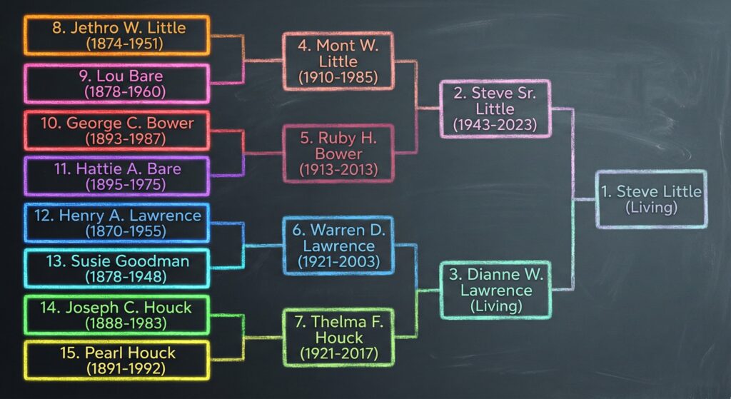 But here’s what made this interesting: it also noticed something genealogists call “pedigree collapse.” The surname Bare appears at positions 9 and 11. Houck appears at positions 14 and 15. Steve’s Appalachian ancestors married within their community so frequently that the tree doesn’t branch—it braids.