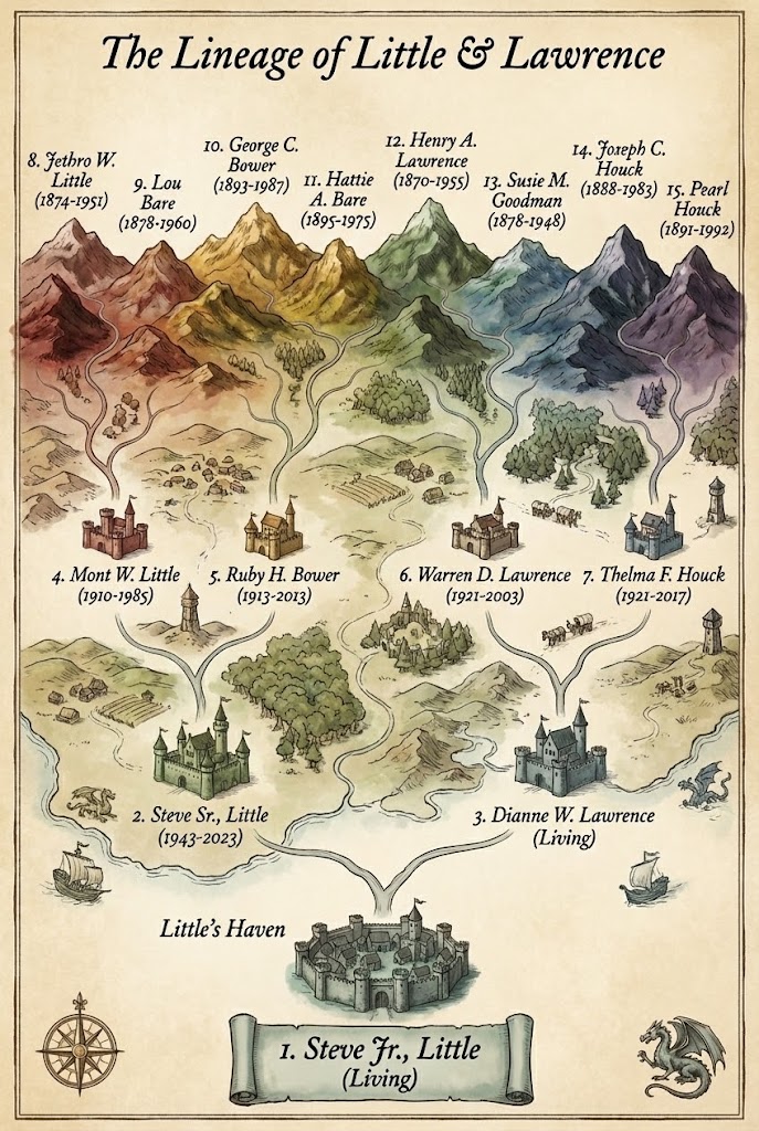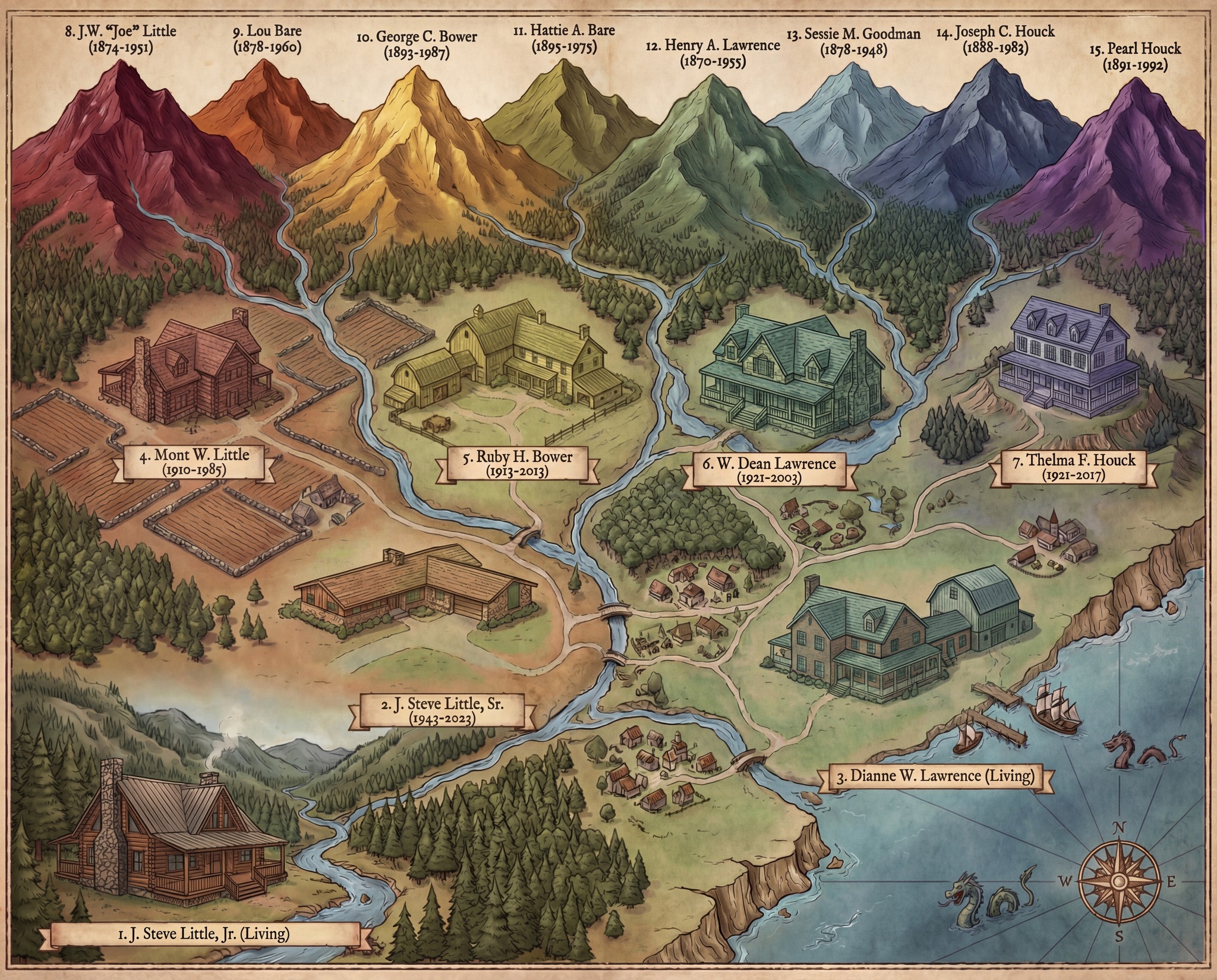 That same tree, transformed into a visual heirloom that can hang on a wall, be gifted to relatives, or be published in a family history—that has different impact. Your great-grandchildren might never read your research notes. But they’ll look at that fantasy map, trace the rivers from distant mountains down to their name, and understand: This is where I came from.