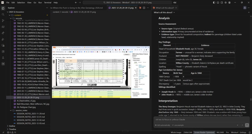 This post is part of the Vibe Genealogy series at AI Genealogy Insights, exploring the frontier of AI-assisted family history research. For the genealogical results of tonight’s session, see “The Night of Nine” at Ashe Ancestors. For background on the project, see “Vibe Genealogy: Here Comes the Sun.”